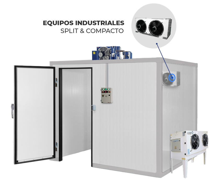 Los equipos industriales pueden ser del tipo Compacto o Split. Usados en espacios que requieran una potencia de 10 HP hasta 15 HP. Es decir que los equipos de la línea industrial trabajan en un rango de 15 ºC a -5 ºC. Sirven perfectamente en la conservación y en el congelamiento de productos de la industria alimenticia y también en industrias que requieran de estos rangos de temperatura.